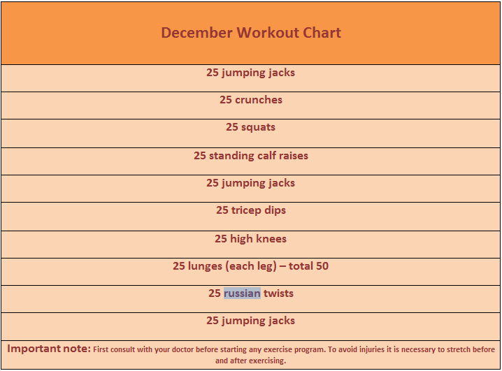 Work out at least 4 times a week, minimum 45 minutes. Since winter is coming, start doing your exercises at home. We’re giving you our “December Workout” chart of exercises you can do at home without using any equipment. Do these exercises at least 4 times a week. Don’t try to push yourself too hard because you can injure yourself and we don’t want it. Do as much repetitions as you can and increase that number over time until you get to 25 reps.