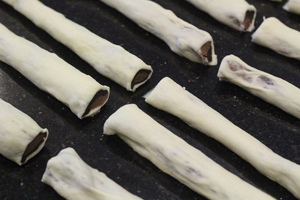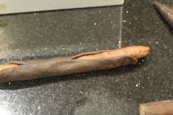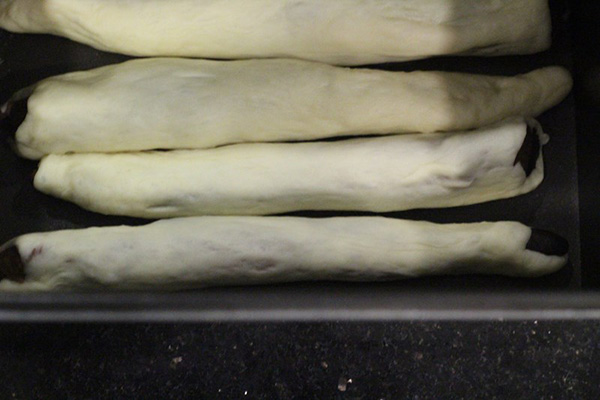 Take the dark chocolate dough and roll it into flat oval shape then cover with the chocolate dough (not fully cover).