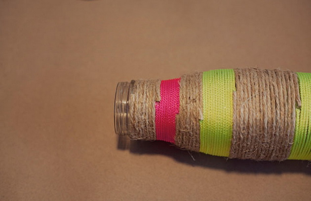 Apply some glue starting from the top of the bottle. Start rolling the rope around the bottle. Do a few lines of rope and then do a few lines of wool.