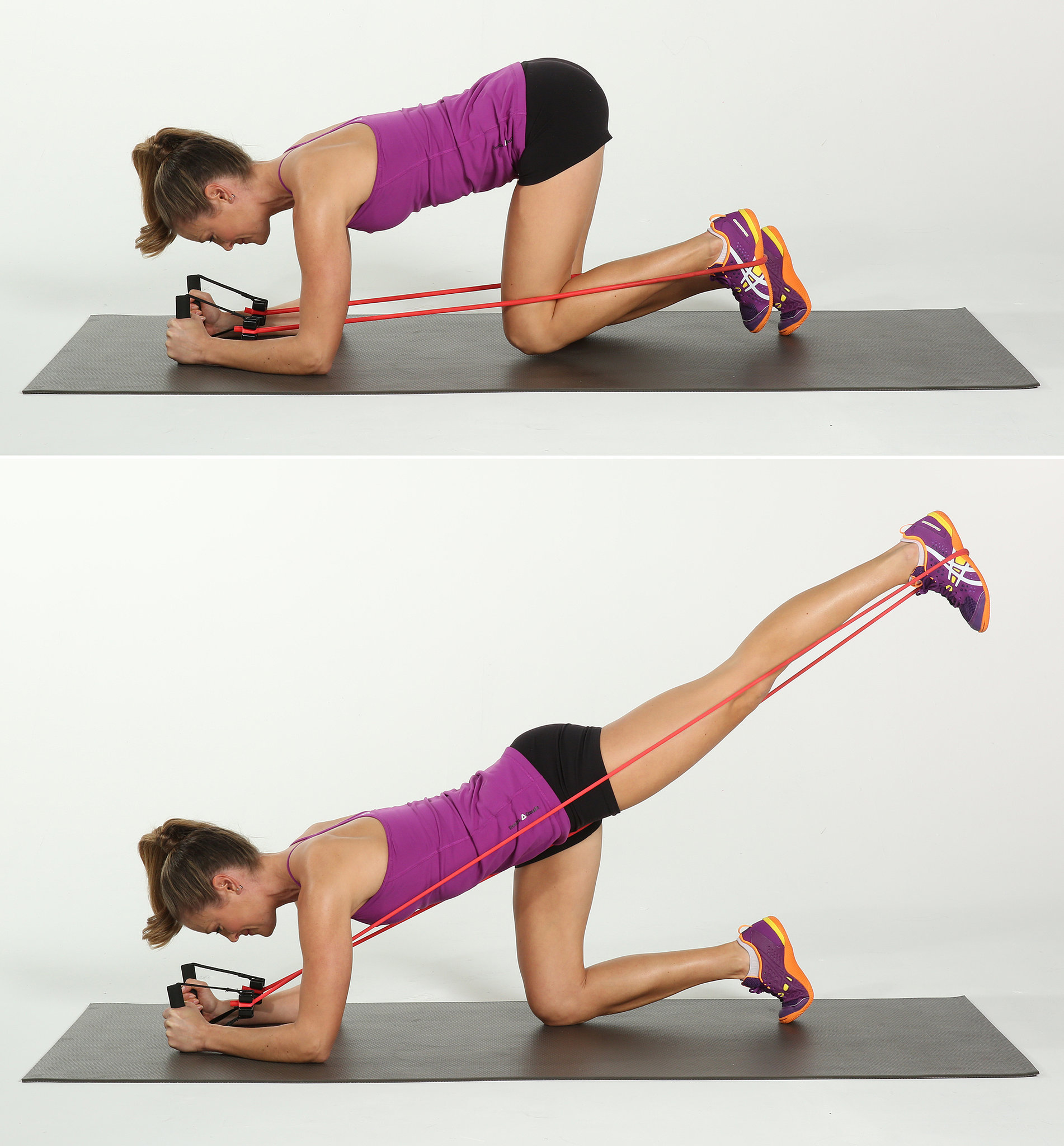 Get down on all fours. Support your body weight on your elbows. Place the resistance band just like it’s placed on the photo. Lift one leg, keep it in straight line with your body and then get it back into starting position. Do 15-20 repetitions with each leg.