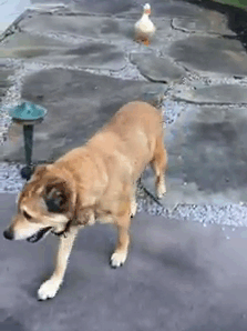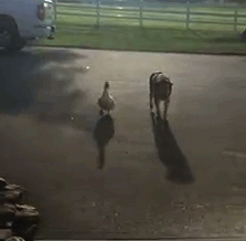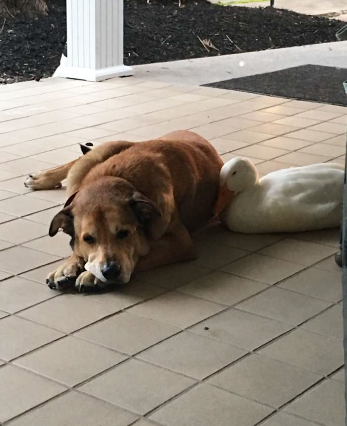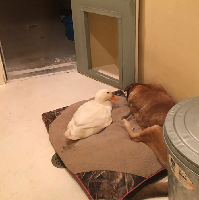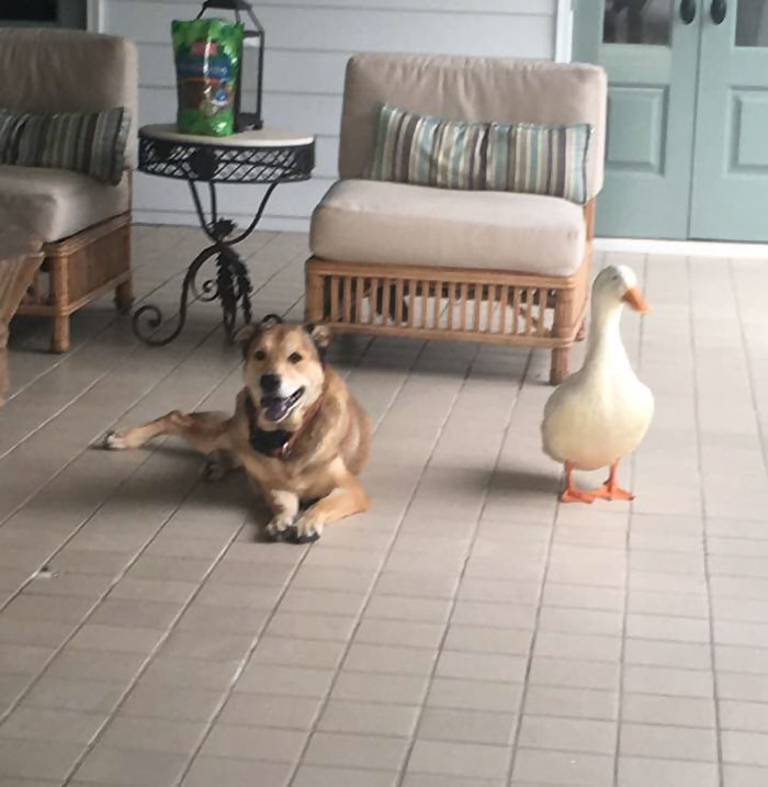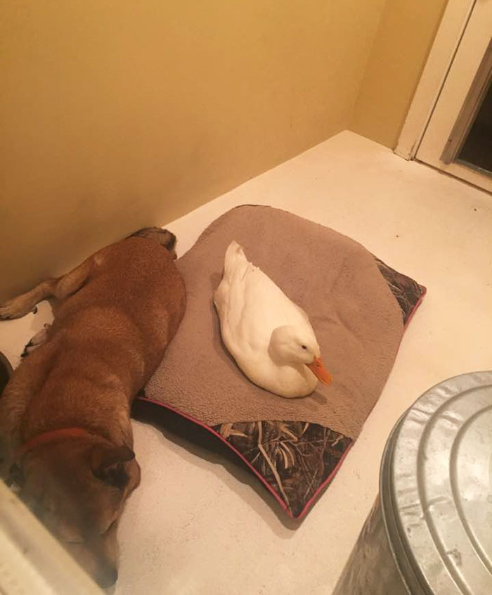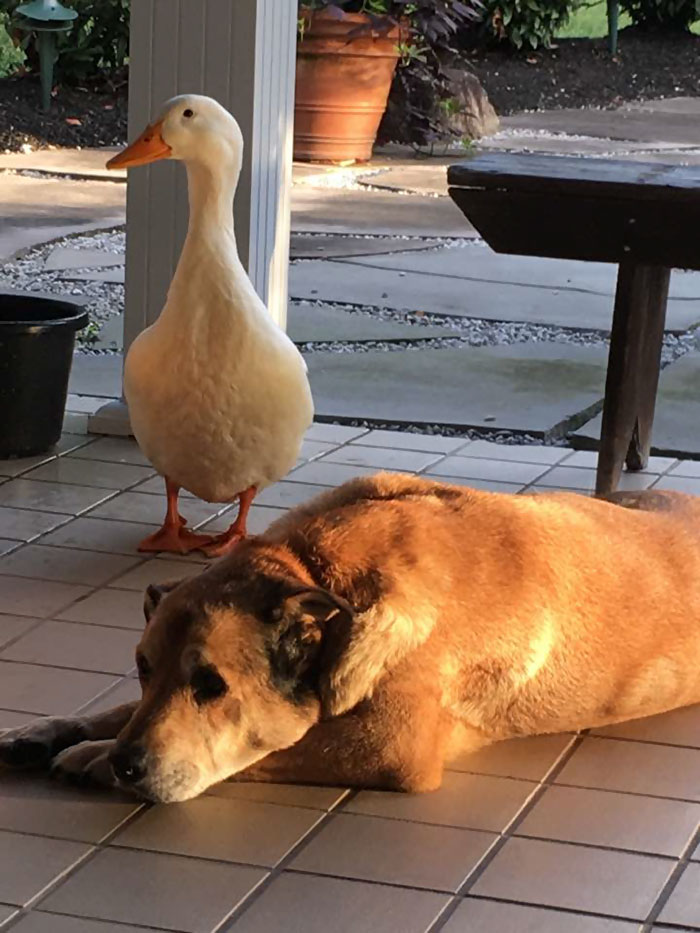 “We have no idea where this duck came from but he sure does love George and since the duck has arrived George has not cried one time,” wrote George’s owner Jacquie Litton on Facebook. “It is strange for a duck to just appear at our house and be attached to your dog and even more strangely the anniversary week of Blackie’s passing.”