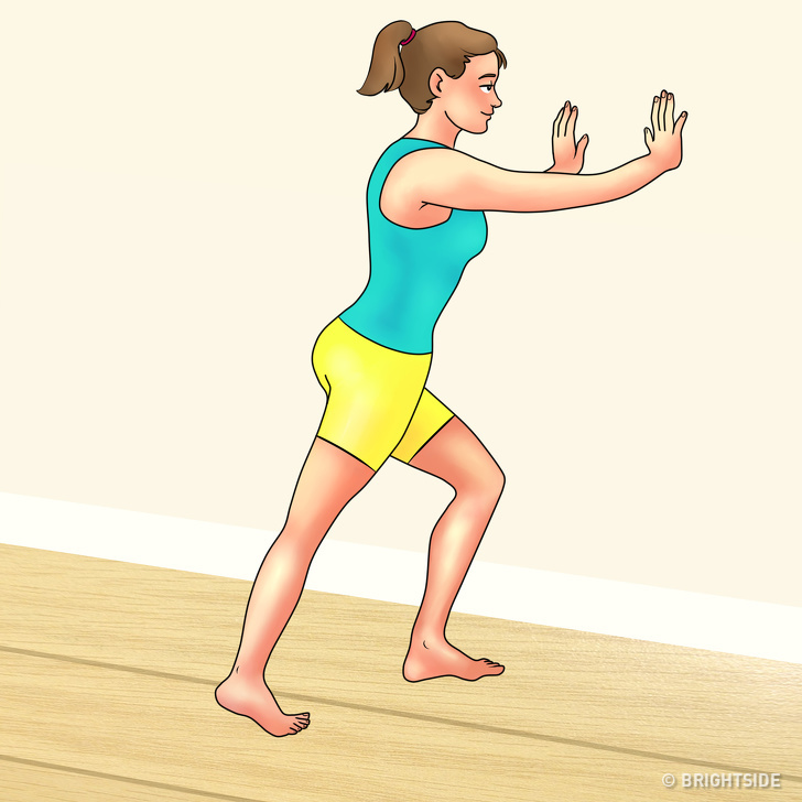 3. Place your hands against a wall. Put your right leg back on your toes. The other foot should be flat on the floor. Hold this position for 30 seconds and do 3 repetitions with each leg.