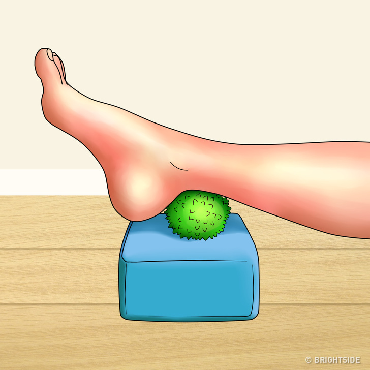 5. Put a massage ball on a yoga block. Place your leg so that the ball will get under your ankle. Roll the ball in all directions for 10 seconds and then push it against the block for 3 seconds. Do 2 repetitions.