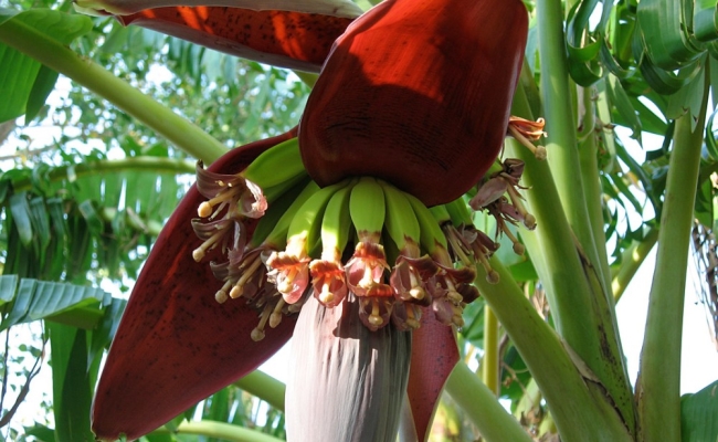 Banana flower grows from the end of the bunch of bananas and its color can vary from red-orange to deep purple. The flower is starchy and slightly bitter, but rich in vitamin A and C. It is included in the diet as a vegetable. The fresh banana flowers are eaten raw. It can be also used as an ingredient for noodles, soup and salads.