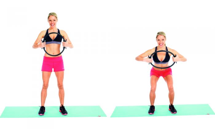 Stand with your feet hip-width apart, and hold the Pilates ring in front of you with your arms bent. Then, bend the legs and lower your bottom out behind you, while pulling the ring apart. Go back to the start position and repeat the same.