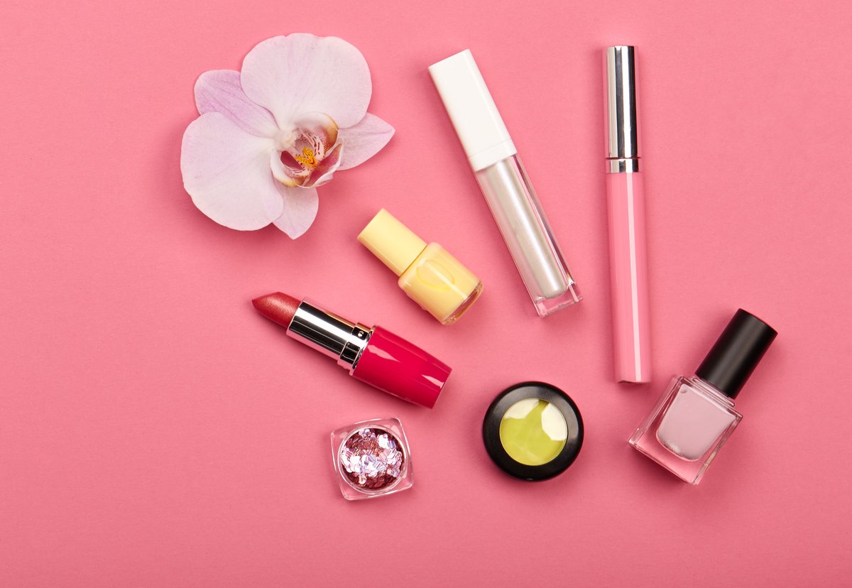 Fashionable Women’s Cosmetics and Accessories. Falt Lay. Nail Polish and Lipstick. Beautiful Orchid Flower. Make Up Cosmetic items Top View