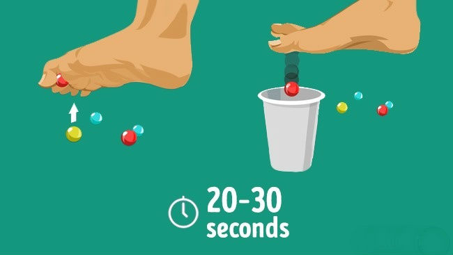 Put some beads on the floor. Take the beads one by one with your toes, and try to put them into a glass.