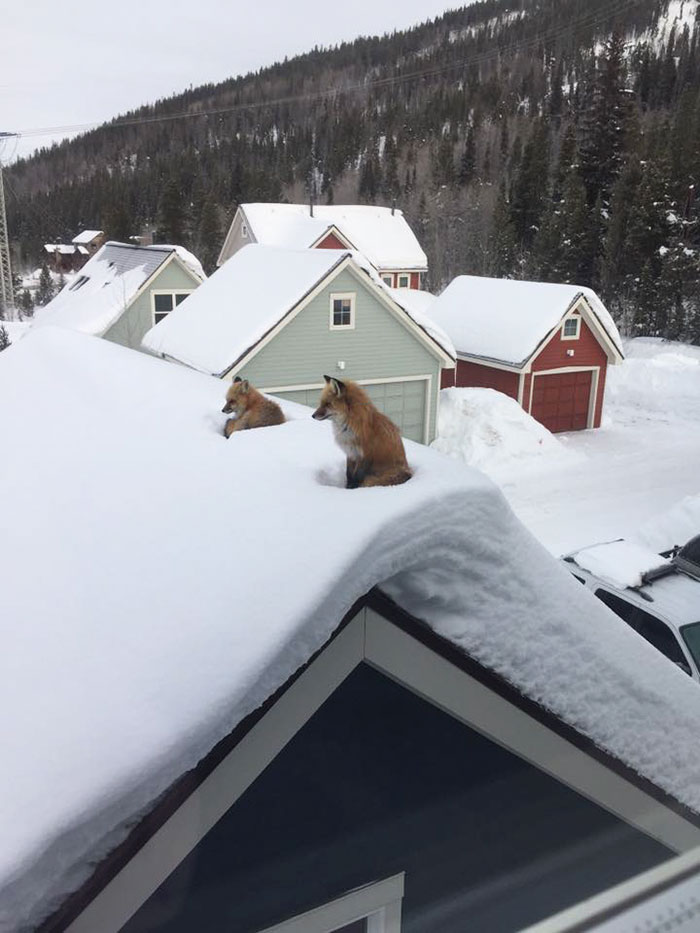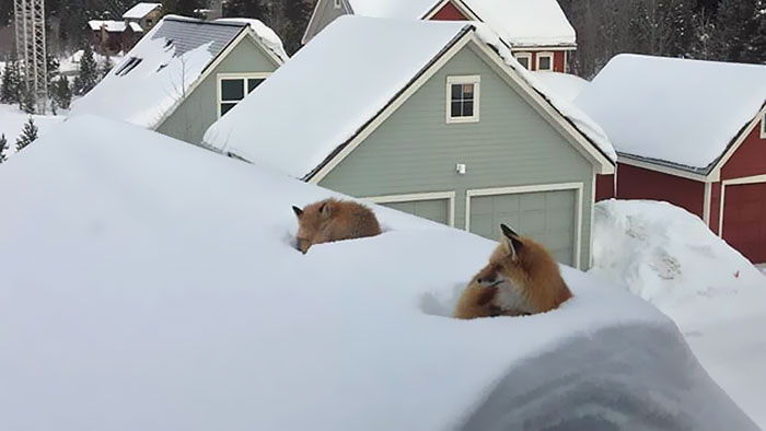 Last week, Breckenridge, Colorado was covered with a ton of snow, and these clever foxes used it to climb on the rooftop to take a nap. Andy Carver noticed them early in the morning settling down to warm up for a bit.