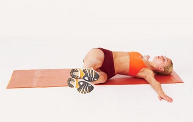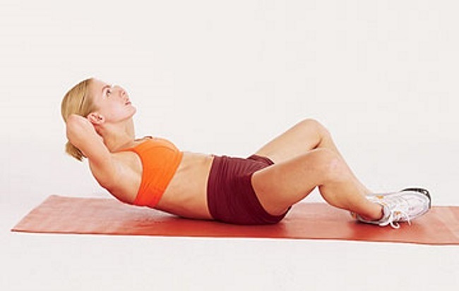 Lie on your back, bend your knees and bring the soles of your feet together to touch. Put your hands behind your head. Lift your torso slightly up and forward, while keeping your back straight. Hold the top position for a few seconds before returning to the ground. Repeat 10 times.