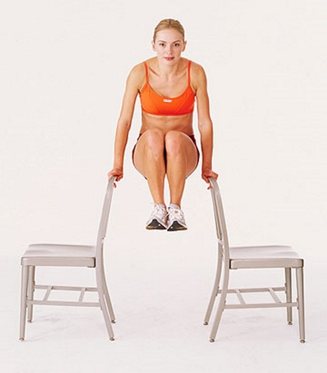 Hold the backs of 2 chairs firmly with both hands. Bend your elbows slightly, lower your shoulders and relax your neck. Slowly lift your knees up to the ceiling. Do 3 sets of 10 reps.
