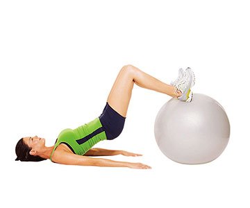 Lie on the floor, put arms by your side and put heels on a stability ball shoulder-width apart with bent knees at 90 degrees. Lift hips toward the ceiling. Hold for 5 seconds, then lower. Perform 10 reps.