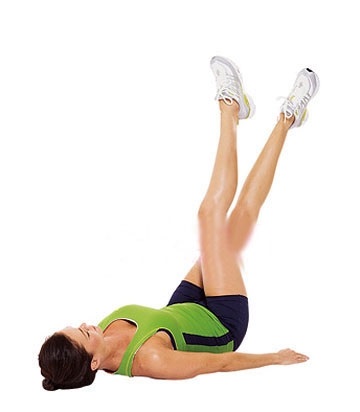 Lie on the floor, put arms by your side and extend your legs. Lift legs at 45 degrees with pointing toes. Quickly open and close your legs, crossing the right thigh over the left and then reversing the movement. Perform 15 reps per side.