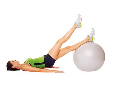 Lie on the floor, put arms by your side and put heels on a stability ball shoulder-width apart. Lift hips toward ceiling. Hold for 5 seconds, then slowly pull the ball toward your body, while keeping your hips lifted, then roll it back to the start. Perform 10 reps.
