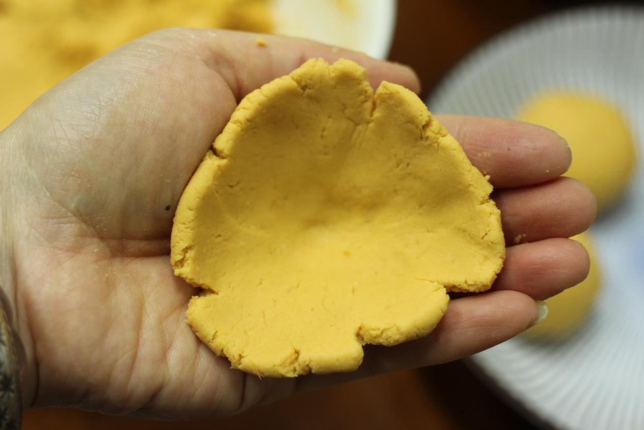 Scoop about half a tablespoon of filling onto the dough and press slightly.