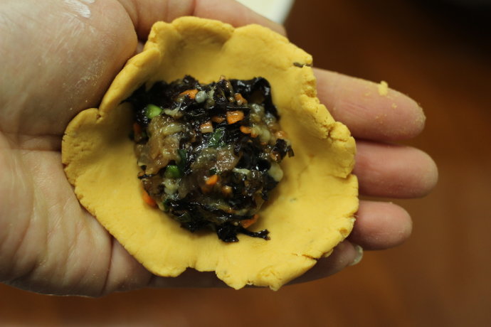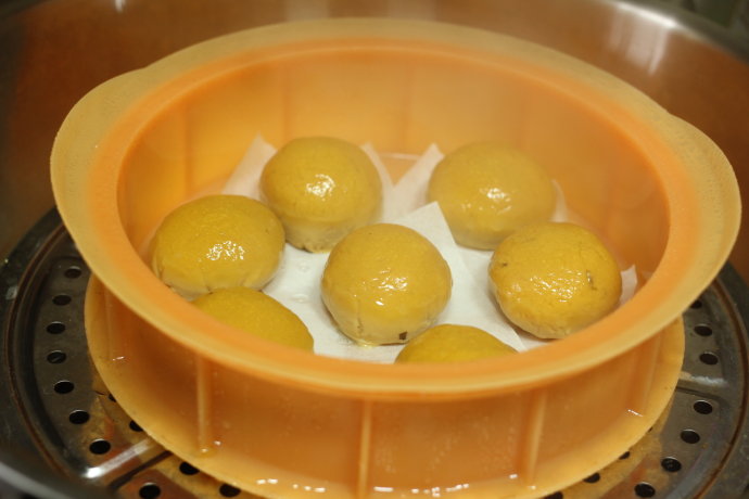 The potato dough is made up mainly of sweet potato flour with a small amount of tapioca flour which produces firm dough suitable for stuffing. The dough is wrapped around the filling and steamed in the steamer.