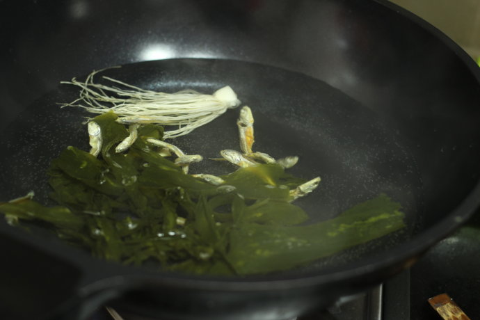Make the seafood stock but putting a small amount of water in a pan and add the whitebait, kelp, and leek roots. Bring to the boil and simmer for 10 minutes.