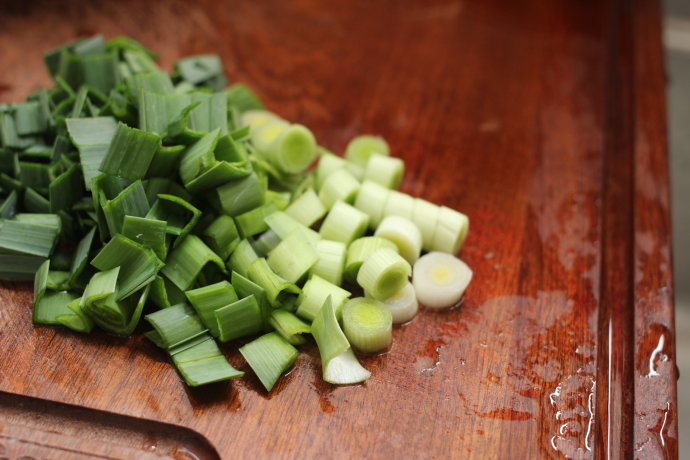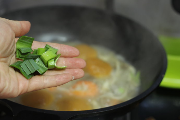 Just before serving, add a handful of chopped leek leaves to the pan.