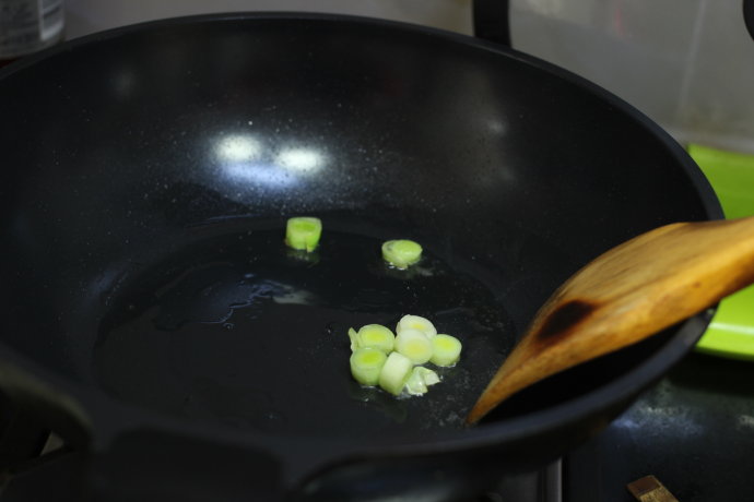 Pour a small amount of cooking oil into a clean pan and sauté the white part of the leek.