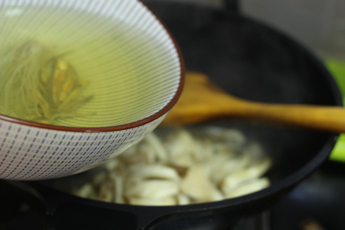When the mushrooms are soft, strain the seafood stock into the pan with the leek and mushrooms.