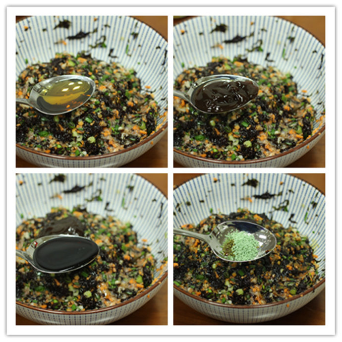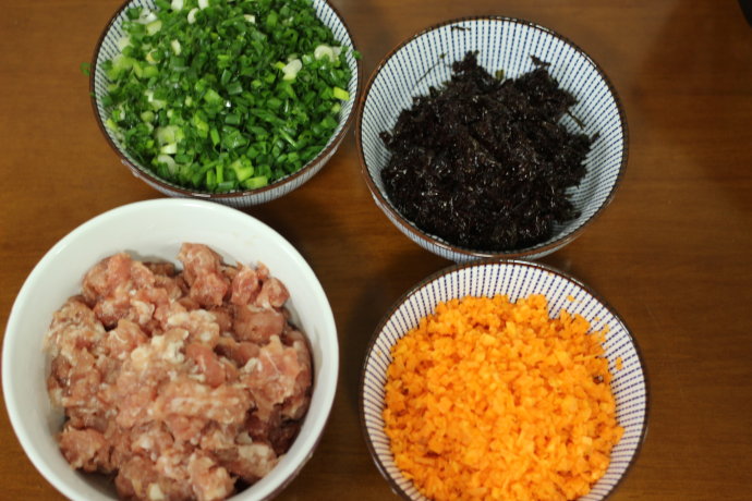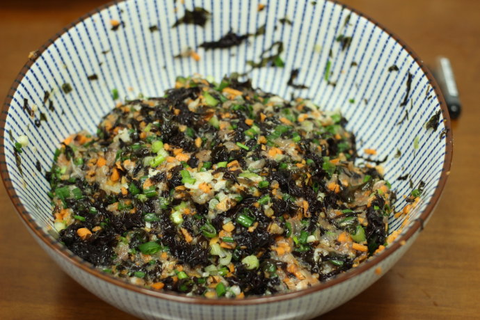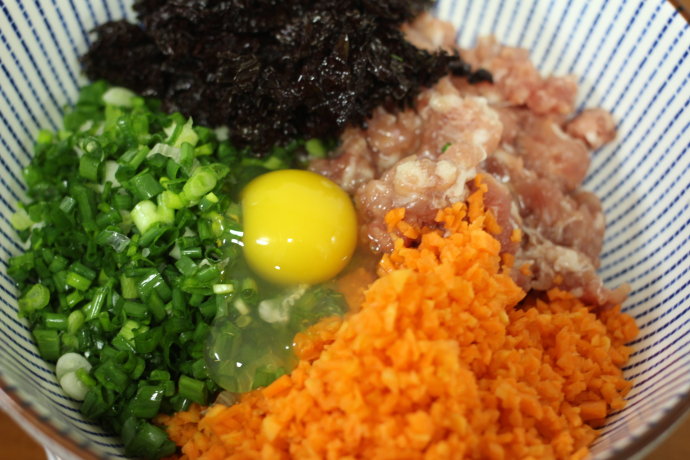 While the sweet potatoes are steaming, chop the green onion, dice the carrot, and cut up the washed dried seaweed with scissors and combine in a bowl with the pork mince.