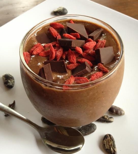 Pour your smoothie into a nice glass and garnish with some goji berries and vegan chocolate bars chopped into chunks.