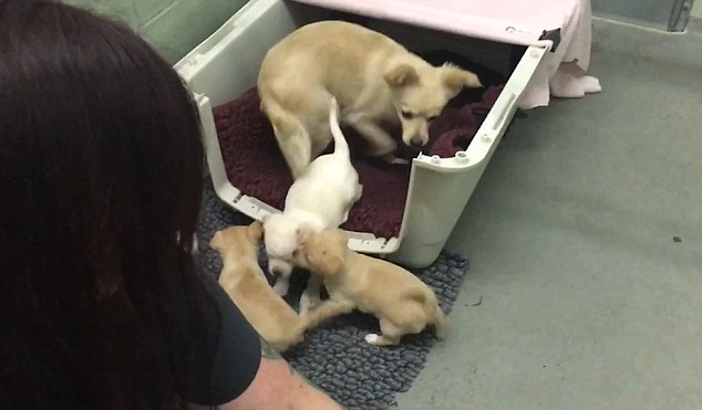 The shelter convinced the family to surrender Cora’s puppies. When Cora saw one of her puppies, she looked up. She stepped forward, recognized her babies and was thrilled with joy.