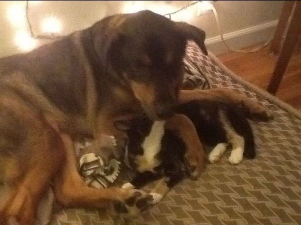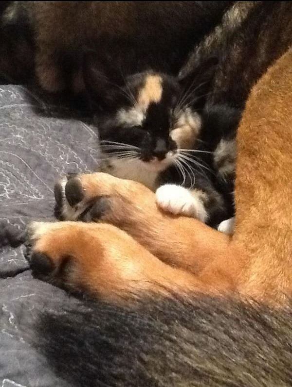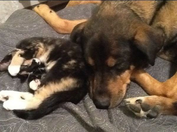 “The first night I brought her home, she was 5 weeks old and she couldn’t sleep unless she was nestled up to my doggy”.