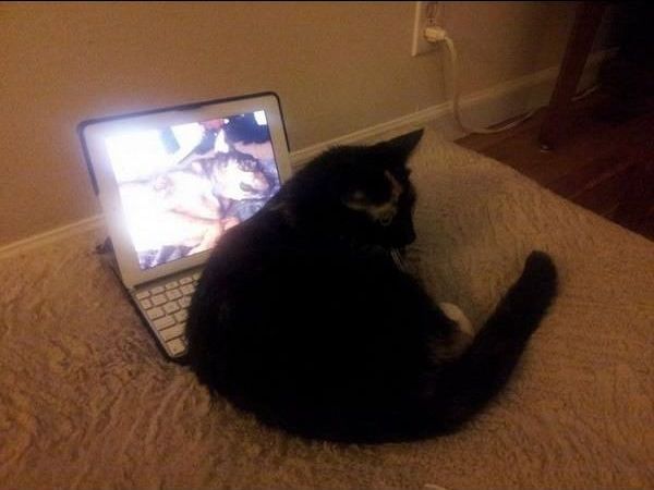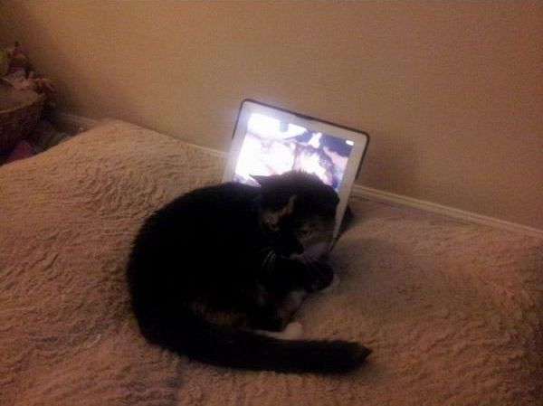 “She watches them and then curls up next to the iPad. She and I miss our big, sweet guy so much!”