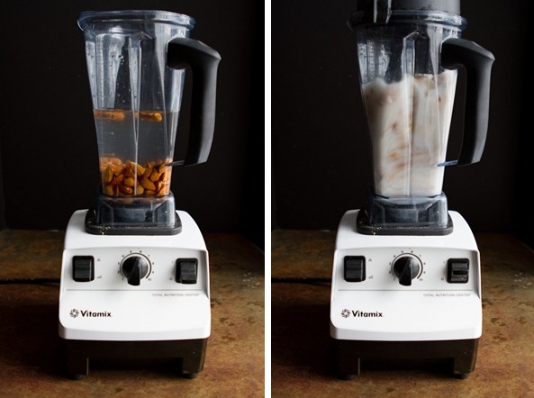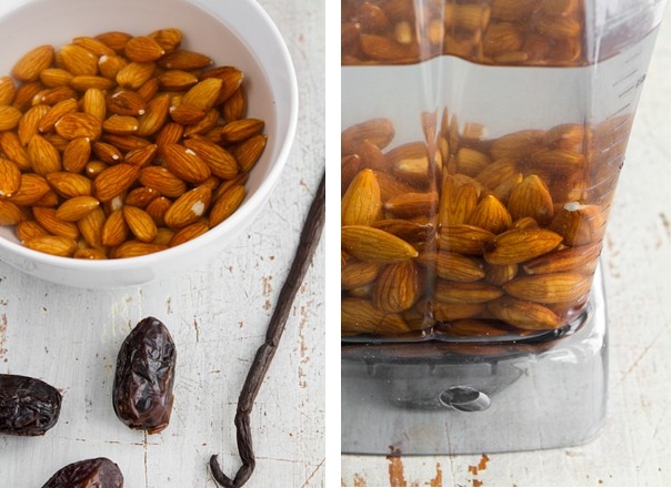 Put the soaked almonds in your blender and add 4 cups of water, the vanilla extract and the dates. Blend until all the ingredients are blended and mixed.