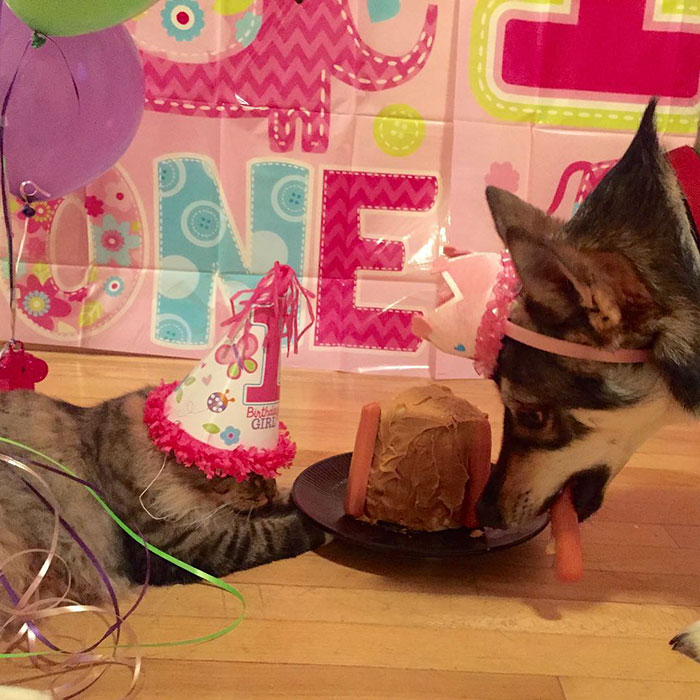 “They are perfect with each other. They don’t cuddle as much as they used to when they were a puppy and kitten. But they’re still always together, always playing together.”