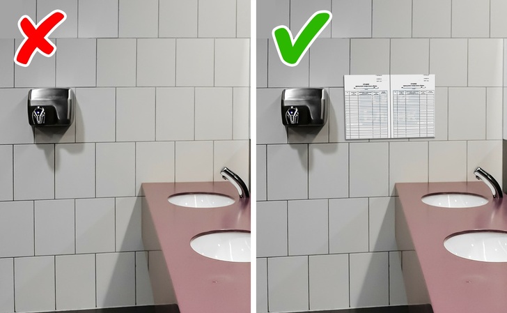 In a clean toilet, there should be a toilet paper, a soap and a cleaning schedule on the wall. Check the schedule to see if the toilet has been cleaned that day.