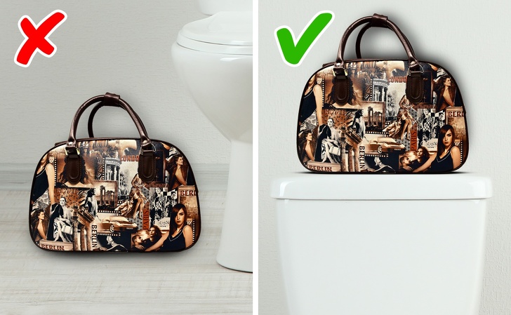 If you’re carrying your bag with you and you’re thinking where to leave it while using the toilet, pick the safest place. Never put your bag on the floor. The safest place to place it is on the toilet tank.