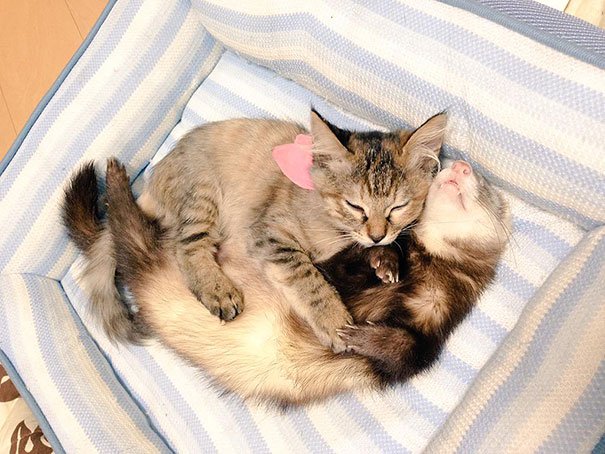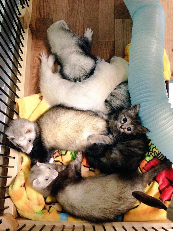 This adorable little kitten is Komari. She was found when she was just 5 weeks old and she got lucky enough to get adopted. Komari got adopted by a family that also has 5 ferrets. With the help and love of her new brothers, Komari’s health improved and she turned into a lovely cat. Komari is the only girl among the gang and she’s always loved and protected. Her owners even think Komari identify’s herself as a ferret, since she’s constantly surrounded by her ferrets brothers.