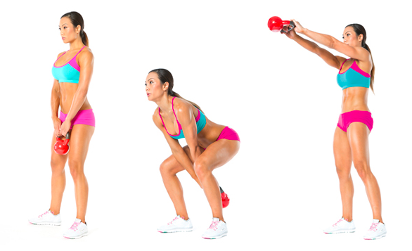 Bend at your hips, and hold a kettlebell (or dumbbbell) with both hands at arm’s length in front of you. Then, rock back slightly and “hike” the kettlebell between your legs. Squeeze your glutes, thrust your hips forward forcefully, and swing the weight to shoulder height. Reverse the movement, so that you swing the kettlebell between your legs again. Continue to swing back and forth.