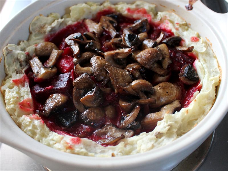 Oil a round baking dish. Heat the oil in a large saucepan, add the onion and cook until it’s soft. Add the flour, remove it from the heat and add the stock while stirring. Return to the heat and cook until it thickens, then add creamed horseradish, mustard, the beets, cream, vinegar, and caraway seeds. Mix everything well. Cook on low for about 30 minutes, until the beets are soft. Put the beet mixture into the baking dish and spread the mushrooms over the beet mixture, cover the dish and bake for about 30 minutes. Garnish the dish with parsley.