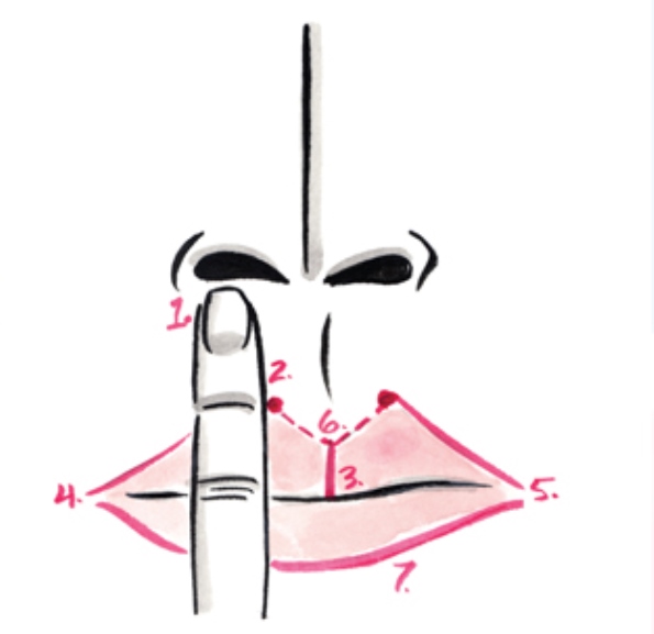 2. With a lip liner, place a dot on the upper lip area aligning the dot on the inside edge of your finger next to the first joint of your finger.