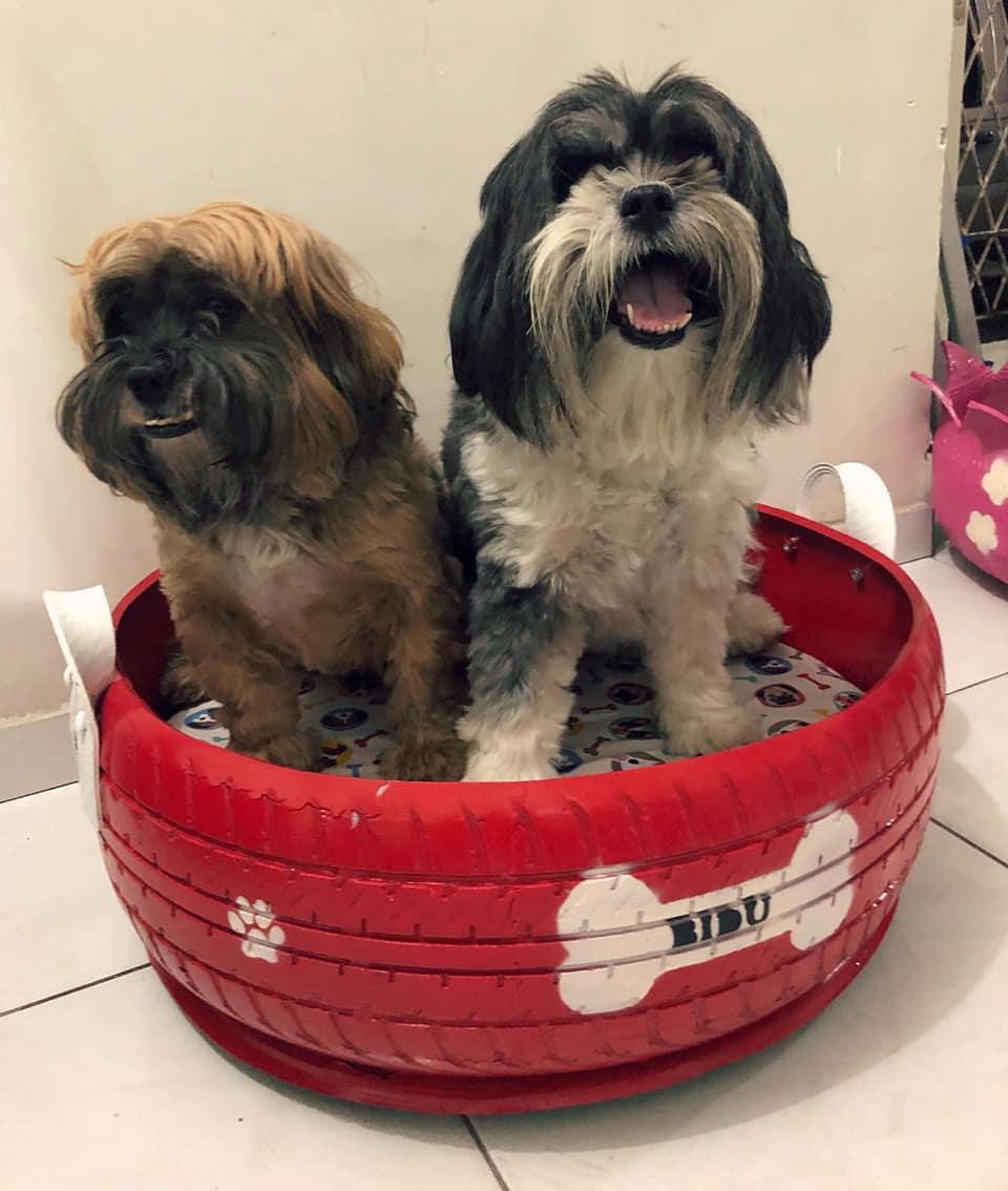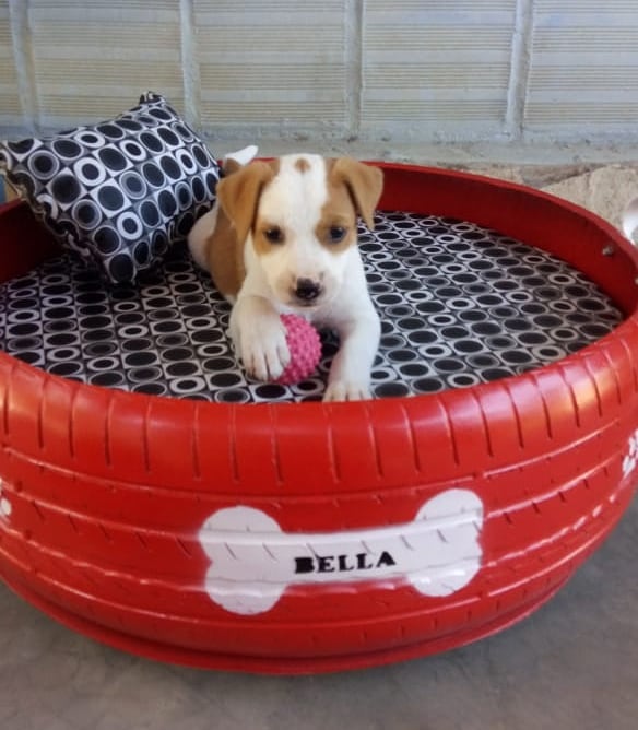 Amarildo picks up every tire he can find on the streets and landfills. He has even received many donations. He cuts the tires, cleans them, paints them with gorgeous colors and then adds a cozy mattress. He does all this by hand and the results is just amazing. He even loves to write the name of the animal who will receive the bed.