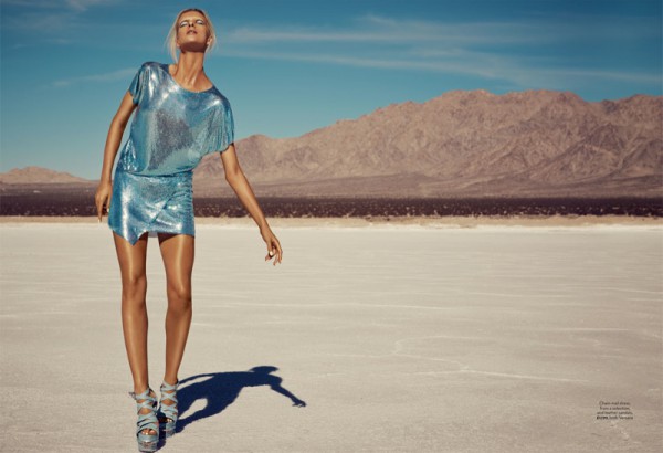 Alyona Subbotina poses in the desert for a summer photo shoot by David Roemer. Wearing sleek and modern looks from David Koma, Kenzo and Burberry.