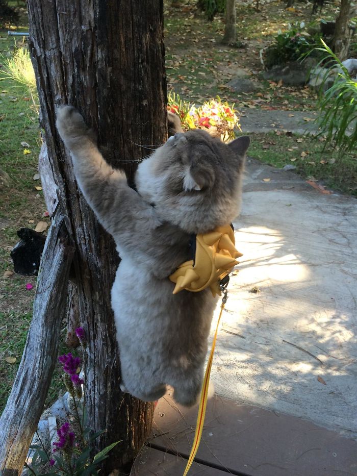 Bone bone really enjoys playing at the park and climbing the trees. When he goes for a walk, he always wears his tiny yellow backpack, that makes him more adorable. The cute fluff ball is a star wherever he goes, and every passerby wants to take a photo with him.