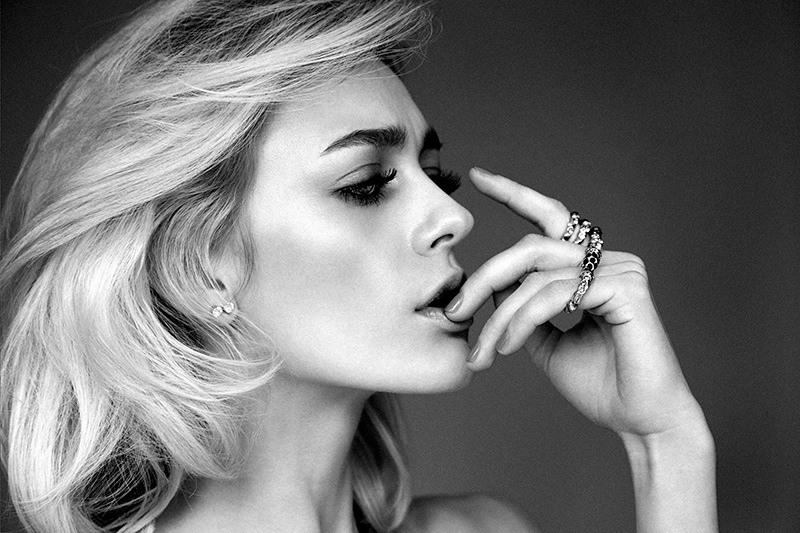 Noa shows off amazing jewelry-looks in the photo shoot captured by Sam Bisso. The amazing blonde model wears sparkling gems and metals from Mari Couci and .