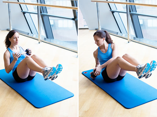 Sit on the floor with bent knees and elevated feet. Grab a dumbbell and hold it vertically in front of your chest and lean back so that your torso is at 45-degree angle to the floor.