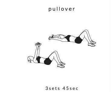 Lie down. Hold one dumbbell in each hand and place your palms so they’re facing your feet. Raise the dumbbells above your shoulders and breath out.