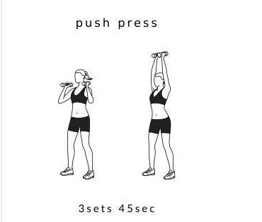 Hold the dumbbells in front of you. Keep your elbows pointing down and palms facing each other. Extend your arms and push the dumbbells over your head.