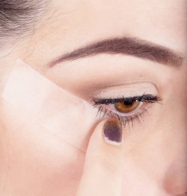 The next thing you need to do is to place the tape underneath your bottom lashes at the outer corner of your eye. Apply the tape angled towards your temple.