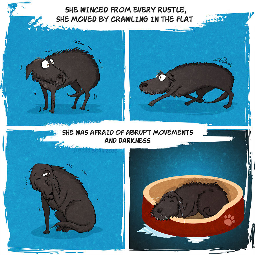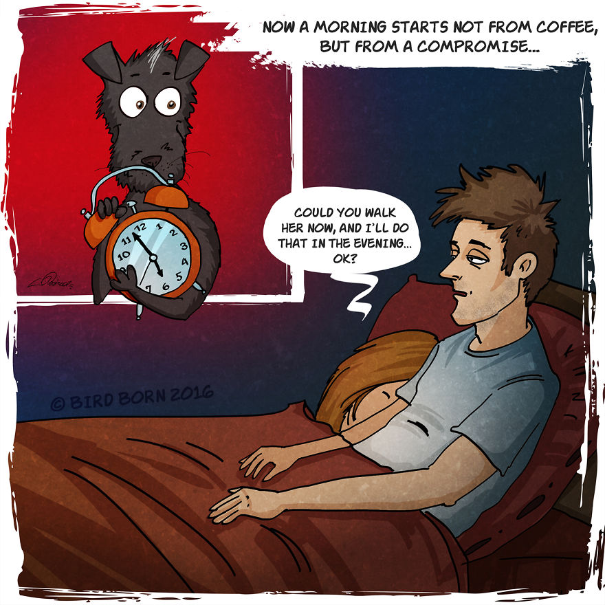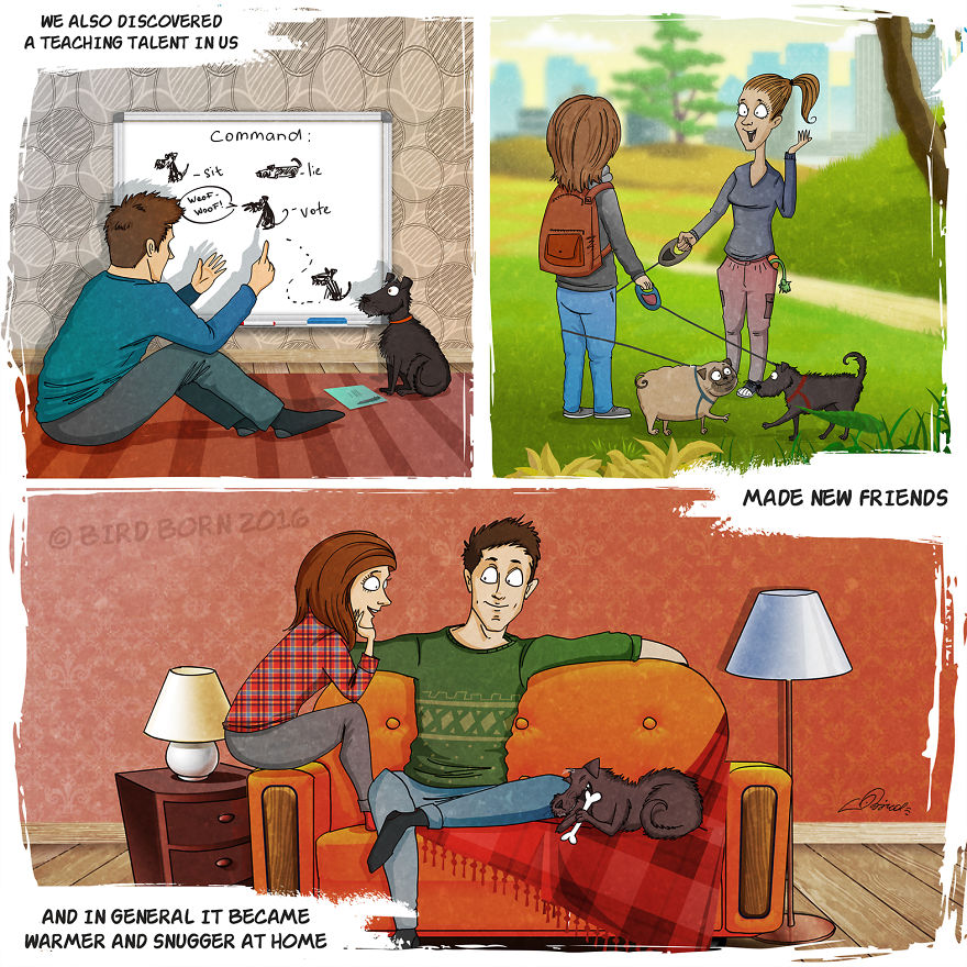Bird Born is a based illustrator from Moscow. He usually creates fun illustrations about the daily lives of people who love cats. Now, after he has taken a dog from an animal shelter, he was so impressed and decided to make a funny comic of his personal experience.