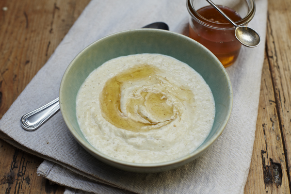 To serve, put the porridge in a bowl, put a tablespoon of yogurt on top and sprinkle with honey.