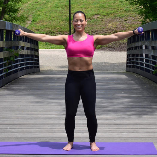 Stand with your feet hip-width apart, knees softly bent and tailbone tucked under. Bring your arms into a “T” position with palms facing down. Then, quickly “flap” arms up and down in a very small range of motion. Perform 8 flaps to complete 1 set. Do 8 sets.