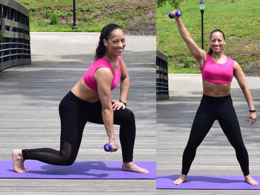 Stand with your feet shoulder-width apart, knees softly bent and abs tight. Grab the weight with your right hand, twist your body to the left, while bending your knees deeply, punching the weight down toward the floor. Return to standing position, facing front, reaching the right arm up toward the sky on a diagonal. Perform 8 reps to complete 1 set. Do 4 sets, then switch sides.