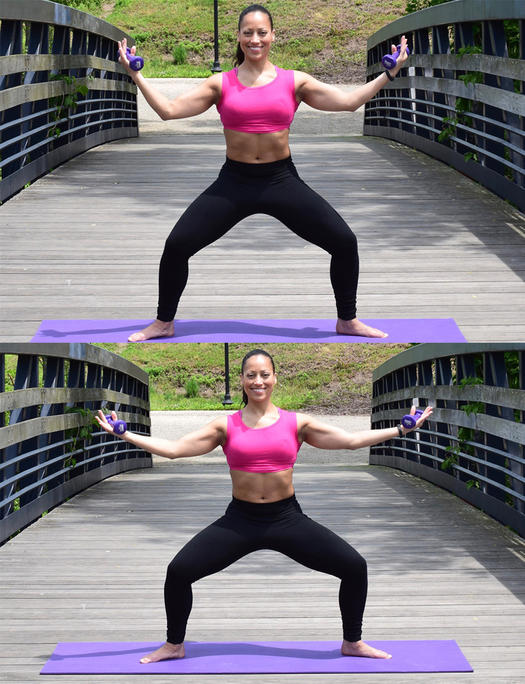 Stand with your feet shoulder-width apart, toes turned out and knees bent. Keep abs in and tailbone tucked under. Bring arms to a “T” position with your palms up. Then, bend your arms, keeping elbows high. The palms should face in, knuckles toward the sky. Bring arms back to a “T” position to return to start. Perform 8 curls to complete 1 set. Do 4 sets.