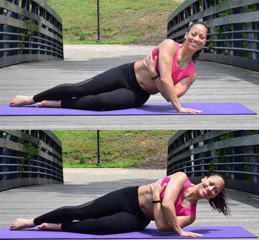 Lie on your left side and place your left arm around ribcage and right hand on the floor next to the left shoulder. Lift shoulders while pressing the floor away with the right hand. Bend right elbow and lower body back down without touching the shoulder to the floor. Press floor away and bring the body back up to an almost straight elbow. Perform 8 reps to complete 1 set. Do 2 sets, then switch sides.